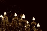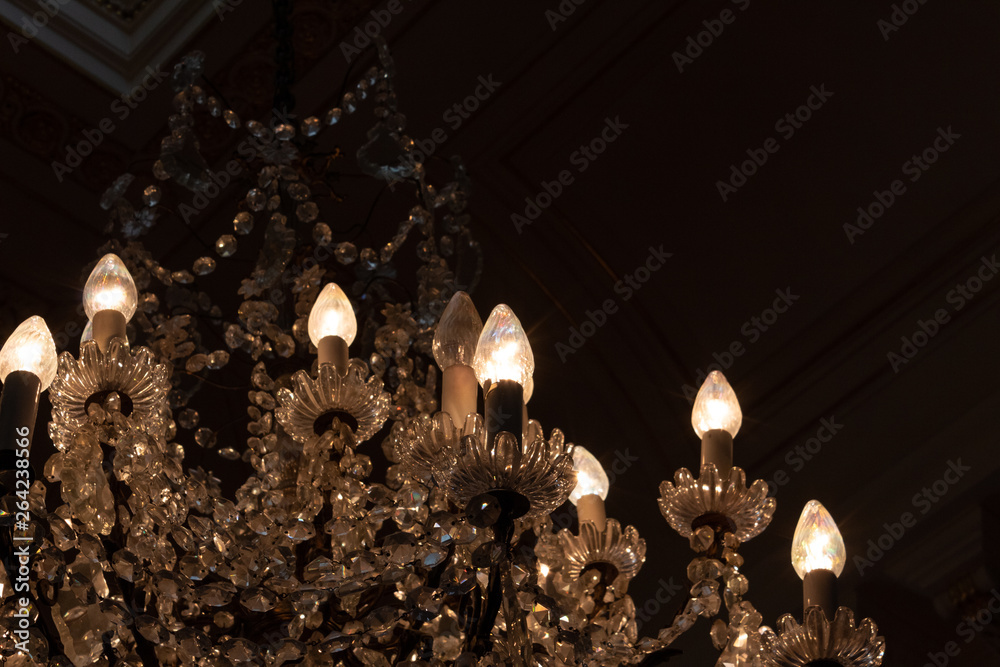 Elaborate crystal chandelier seen from beneath, dark room, copy space, horizontal aspect