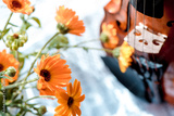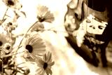 Horizontal image of the bottom half of violin with sheet music and flowers the front of the fiddle on windows