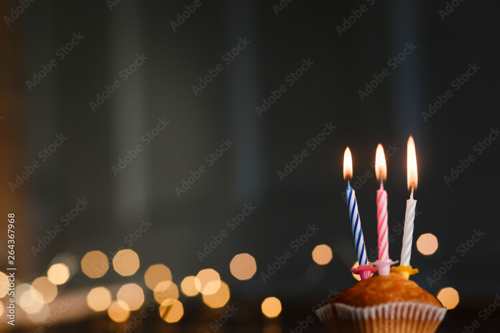 three multicolored candles in the cake, burning candles on the table against the background of a garland of lights with space for text. Concept for the day of birth, 3 years, greeting card
