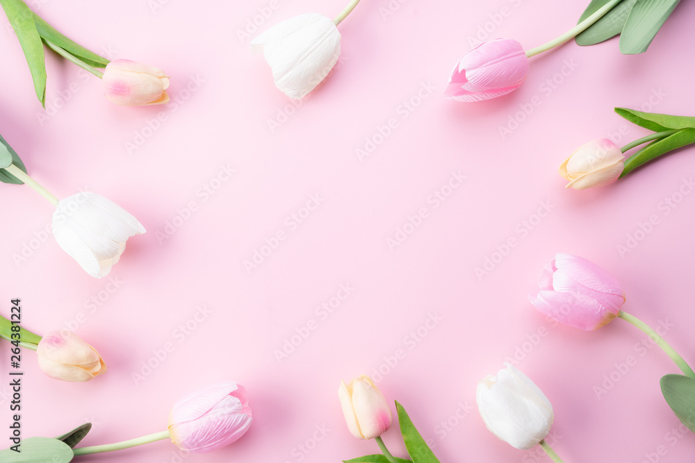Happy mothers day concept. Top view of pink tulip flowers in frame on pink pastel background. Flat lay.