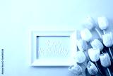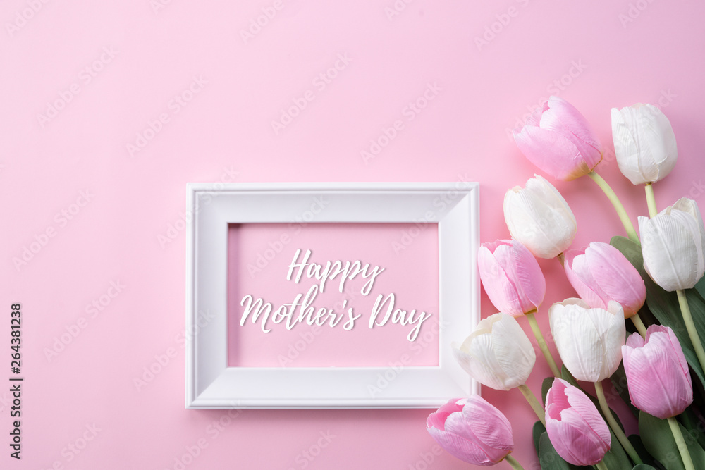 Happy mothers day concept. Top view of pink tulip flowers and white picture frame with happy mothers day text on pink pastel background. Flat lay.