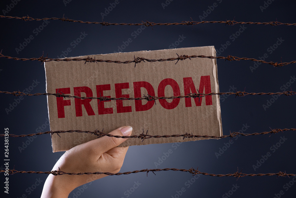 Woman holding cardboard paper with FREEDOM text and rusty sharp bare wire on dark background, conceptual image.