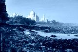 Indias contrast of ugly pollution and stunning beauty, The banks of Yamuna River polluted with garbage and beautiful Taj Mahal in the background