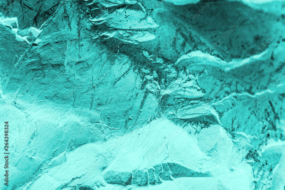 Vintage azure background. Rough painted wall of turquoise color. Imperfect plane of cyan colored. Uneven old decorative toned backdrop of aqzure tint. Texture of teal hue. Ornamental stony surface.
