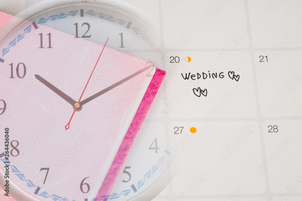 Word Wedding to Reminder Wedding day in calendar planning and pen with heart.