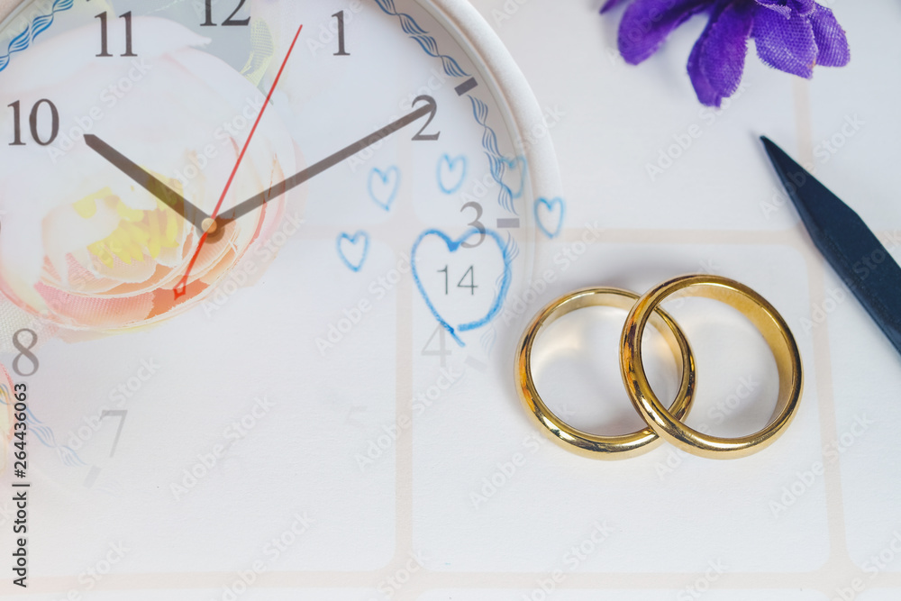 Word Wedding to Reminder Wedding day with Wedding ring on calendar planning and office tool.