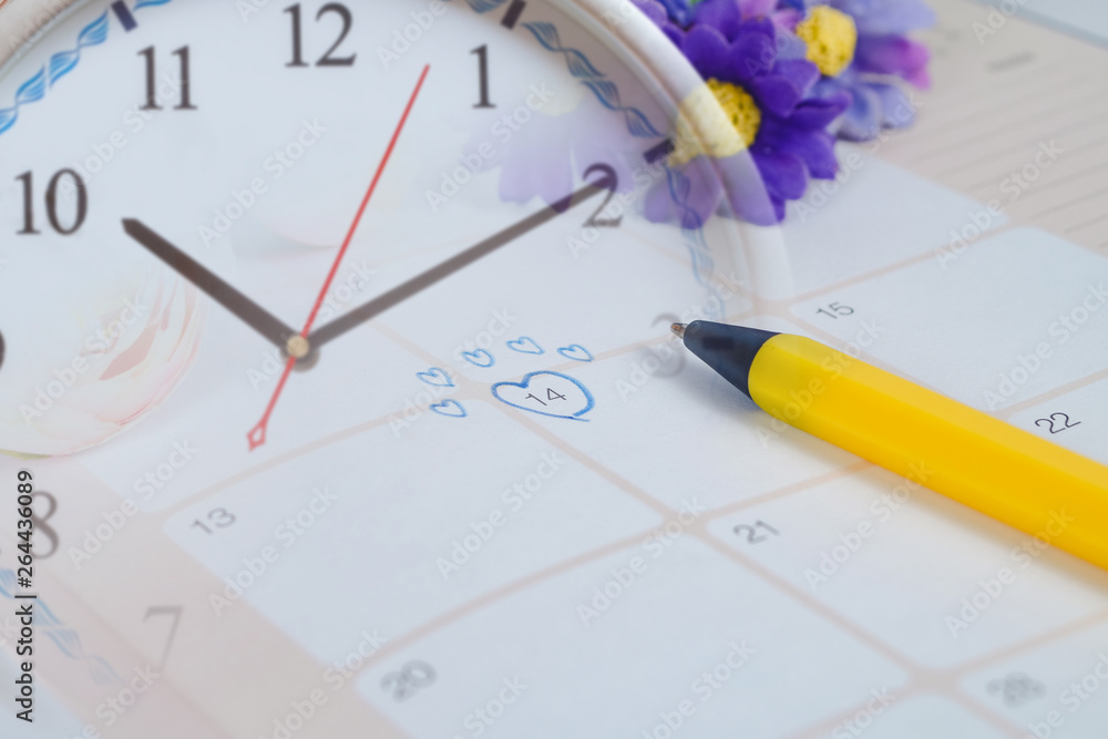 Word Wedding to Reminder Wedding day in calendar planning and pen with heart.