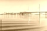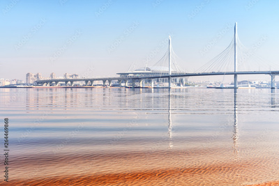 Idyllic seascape in Saint Petersburg, Russia with elevated highway, distant bridge and reflections