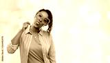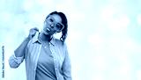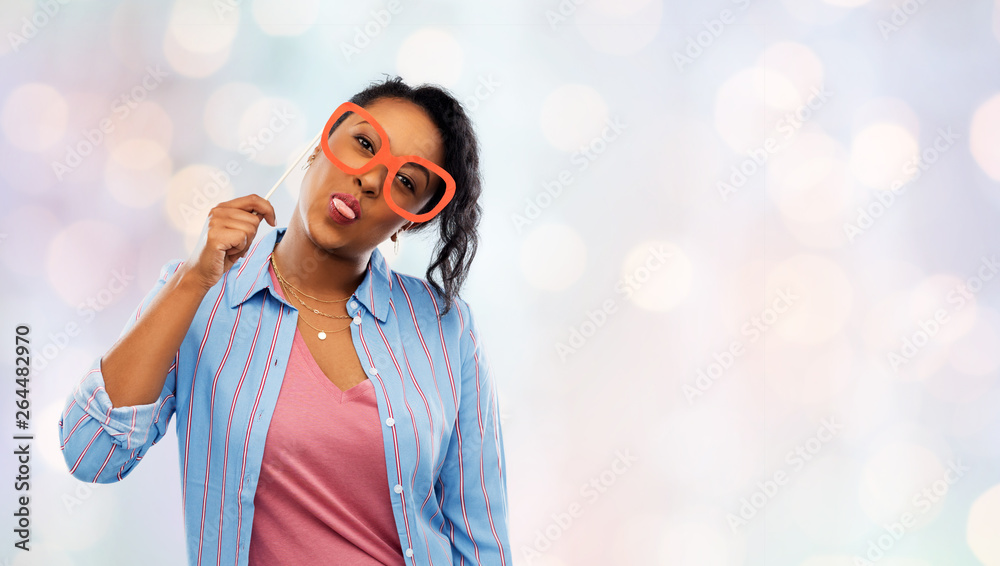 party props, photo booth and people concept - happy african american young woman with big glasses showing tongue over festive lights background