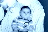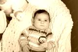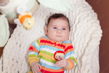 Cute adorable smiling white Caucasian baby boy girl lying in bouncer chair. Awake aware newborn infant child watching small rotating toys on babygear above. View from top overhead.