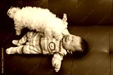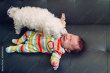 Crying screaming Caucasian baby girl boy lying on bed couch with white dog by his side. Natural emotion expression. Candid childhood lifestyle. Relationships of domestic animal pet and child