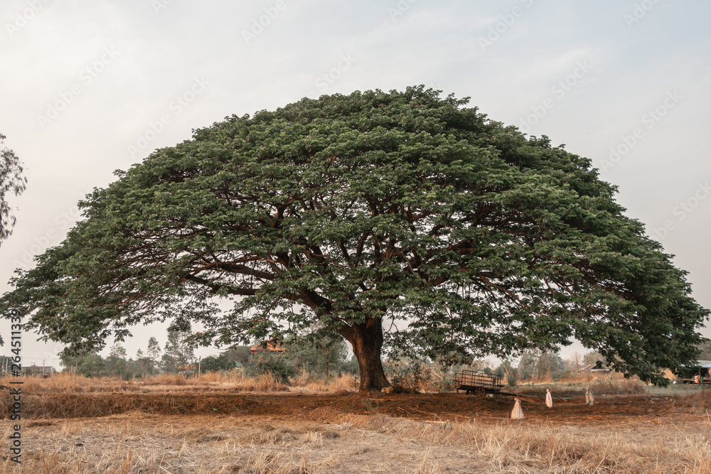 Selective focus giant Monkey pod tree in dried field.Also sometimes known as Samanea saman,Albizia Saman or the rain tree.