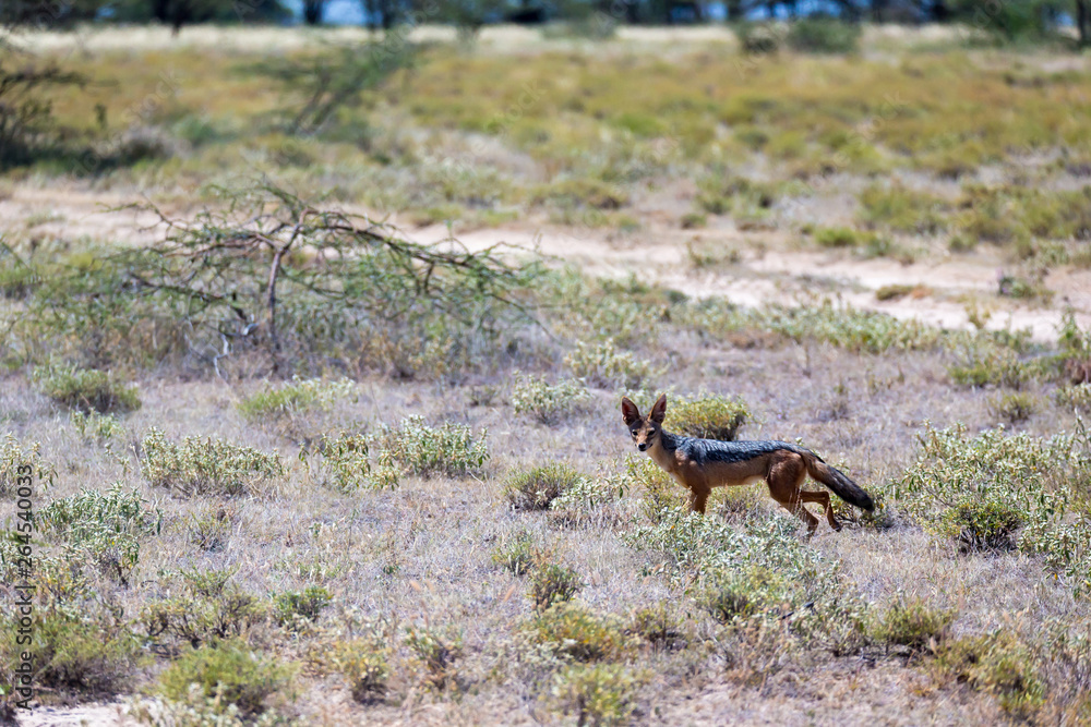 A jackal stands in the middle of a field in the grass