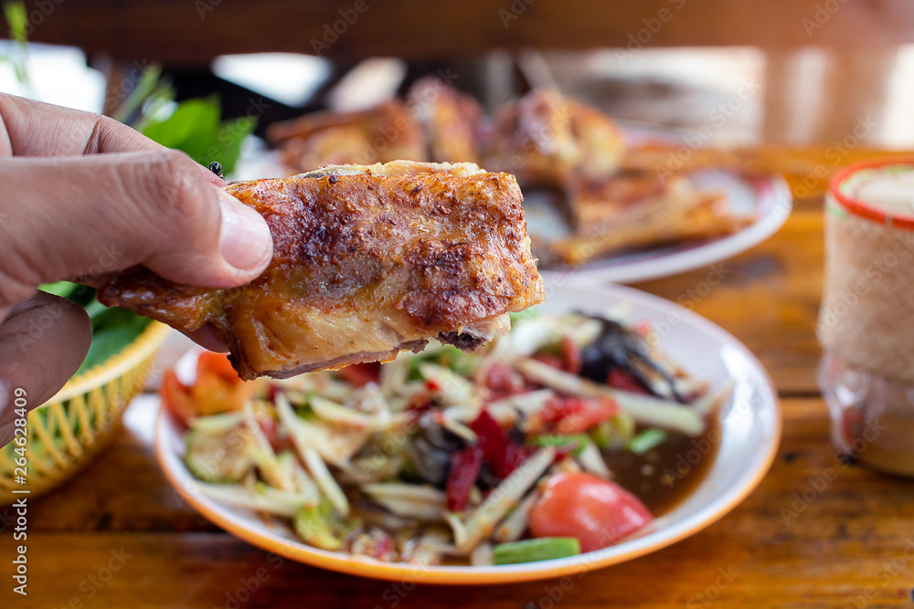 Hand holding the grilled chicken with papaya salad or somtum and sticky rice in wicker basket