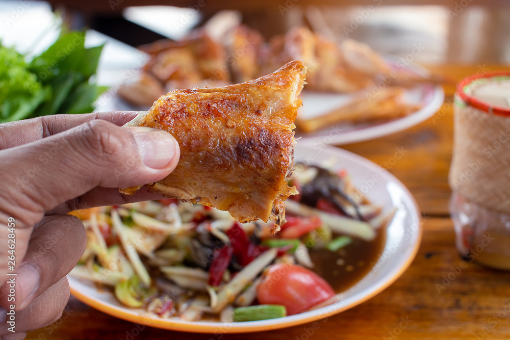Hand holding the grilled chicken with papaya salad or somtum and sticky rice in wicker basket