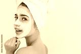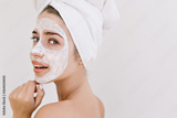Close-up portrait of beautiful young woman with towels after take bath make cosmetic mask on her face. Rejuvenation, cosmetology, hydration and care face. Spa. Clean and perfect skin.White background