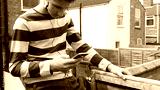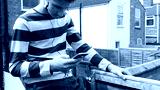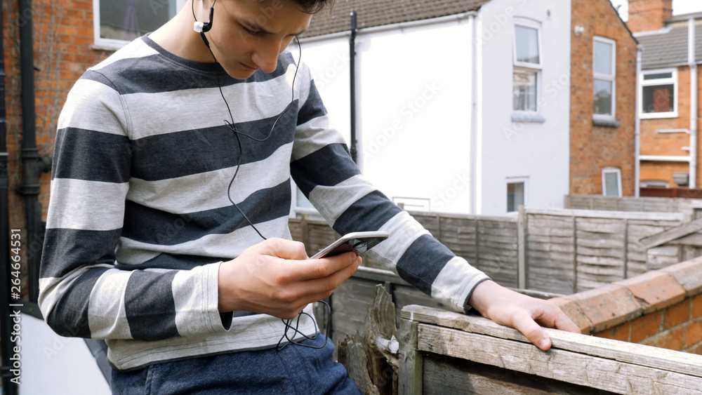 teen boy with smart phone listening or talking while sitting in british backyard garden. teenager and social media concept