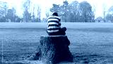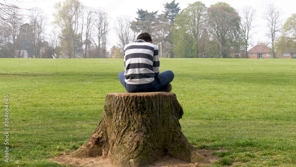 teen boy with smart phone listening or talking while sitting on stump in british park. teenager and social media concept
