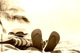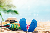 Beach accessories straw hat, flip flops, towel on sunny tropical beach, summer holidays, Caribbean island vacation, hot summer day