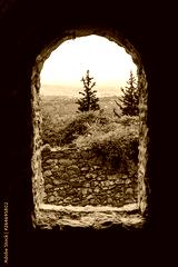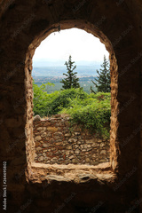Arch window in the wall of the ruin of medieval house in abandoned city Mystras, Peloponnese, Greece