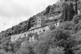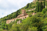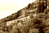 View to the Pantanassa Monastery surrounded by ruins of abandoned byzantine town Mystras, Greece