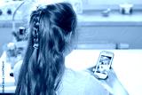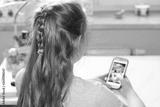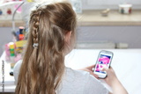 Blond hair girl sits on her back at table, plays with smartphone close up