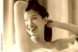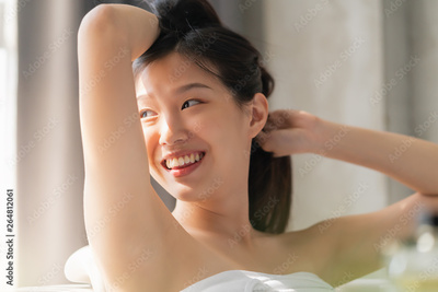 young pretty asian teen woman enjoy relaxing in bathroom morning light freshness feeling moment