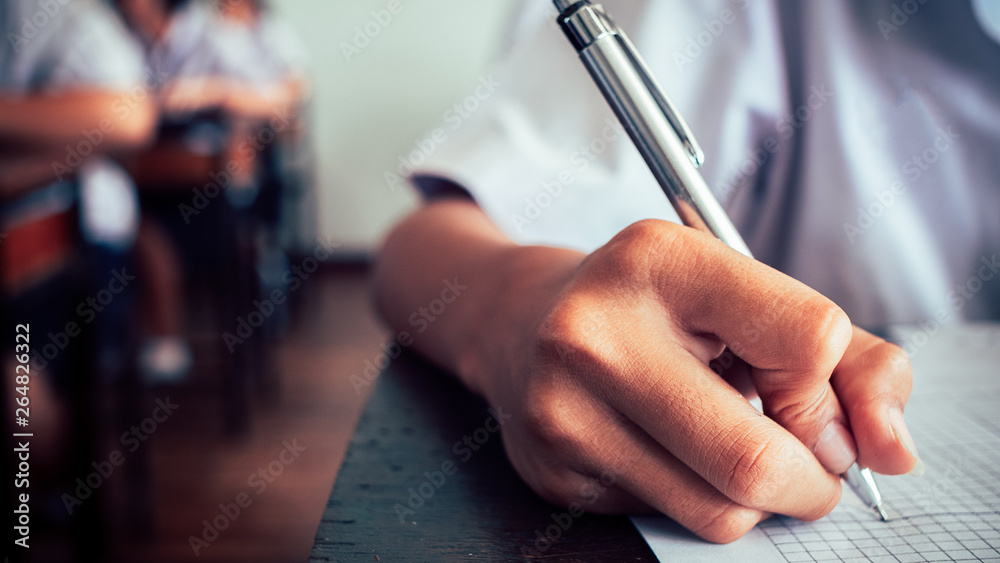 School Students hands taking exams and writing examination with holding pencil in classroom.16:9 style