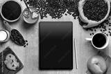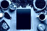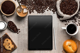 Above view of computer tablet with coffee shop ingredients in cafe, blank screen copy space