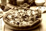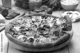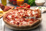 Delicious close up of a fresh handmade pepperoni pizza with cheesy slice next to organic ingredients