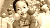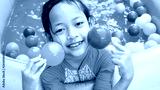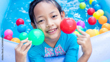 Asian Child Girl Having Fun In Garden Paddling Pool with color ball