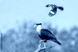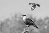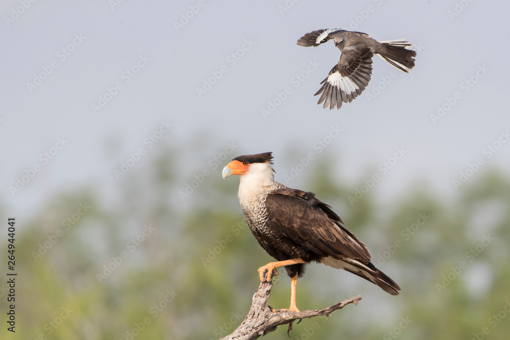 Crested Caracara harassed by Northern Mockingbird in Southern Texas