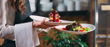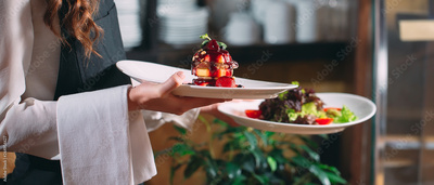 Waiter serving in motion on duty in restaurant. The waiter carries dishes