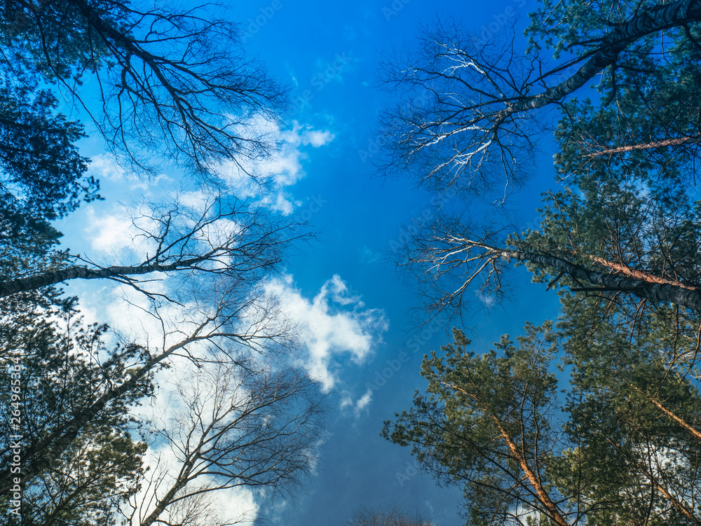 Korony drzew na tle błękitnego nieba