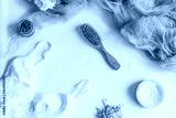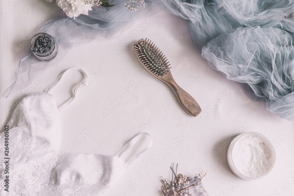 Natural spa set for woman. Hair care, pampering. Sandalwood comb, cream, sleeping mask. Flat lay photography, top view, wooden background