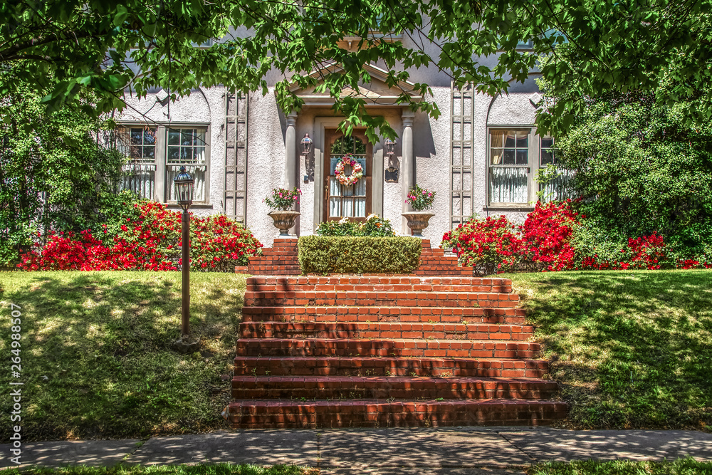 Tree shaded dappled sidewalk and sloped lawn in front of upscale stucco house with wreath and azaleas and brick steps - beautiful landscaping - curb appeal