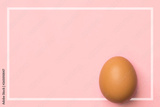 One brown egg on pastel pink background in white frame. Easter concept. Trendy minimalist style. Holiday card poster banner with copy space