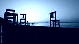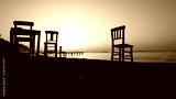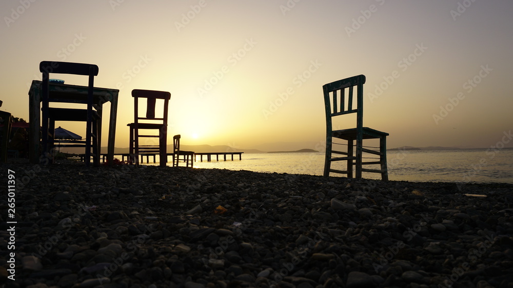 Empty wooden chairs on pebble beach during dramatic sunset. Summer is coming and outdoor / outside conceptual photo. Amazing sunset over mountains & ocean horizon at weekend. Sunny day at outdoor cafe