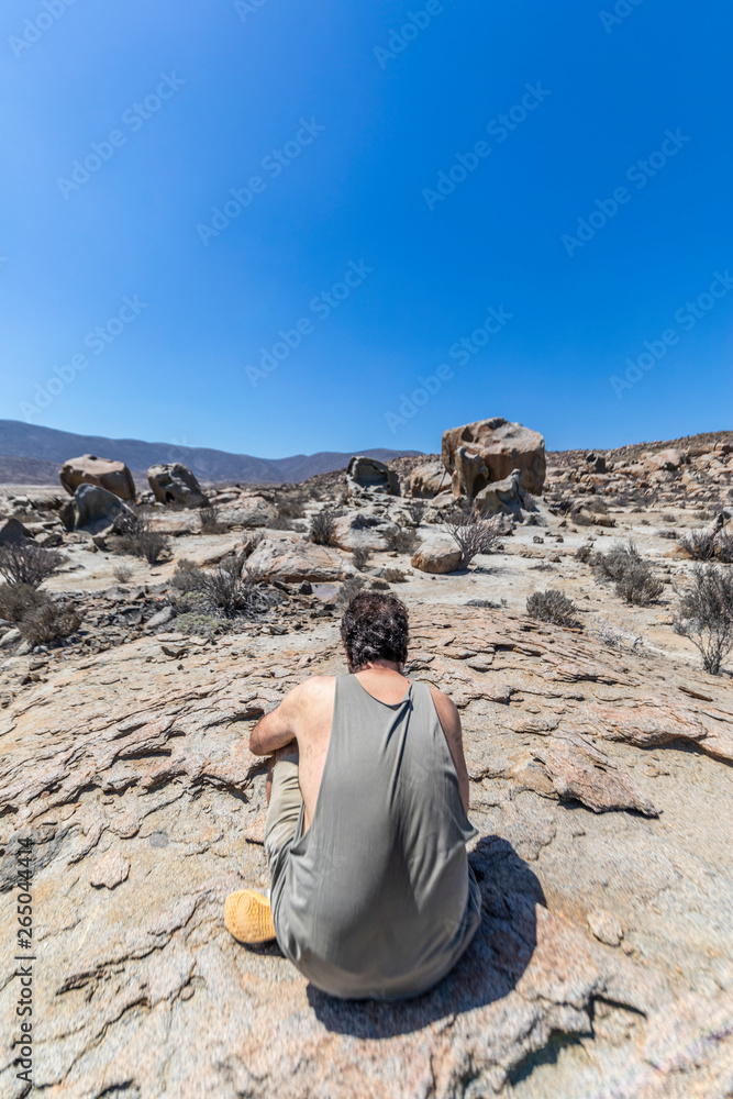 One adult man hiker seating looking at big rock boulders landscape at Atacama Desert. Awe scenery with amazing rock formations creating rare forms on a natural arid environment on a stone scenery