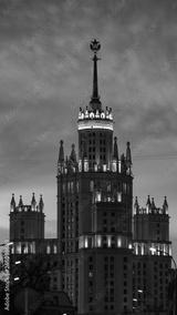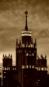 Residential building on Kotelnicheskaya Embankment after sunset, one of seven Stalinist skyscrapers in Moscow.