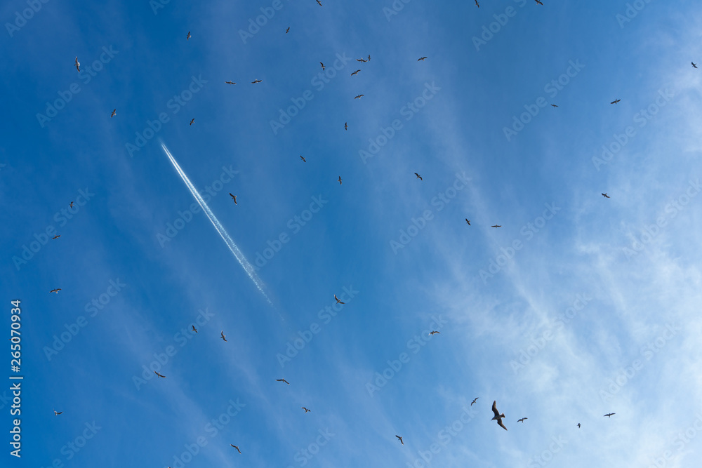 the plane flies around a lot of birds in the blue sky