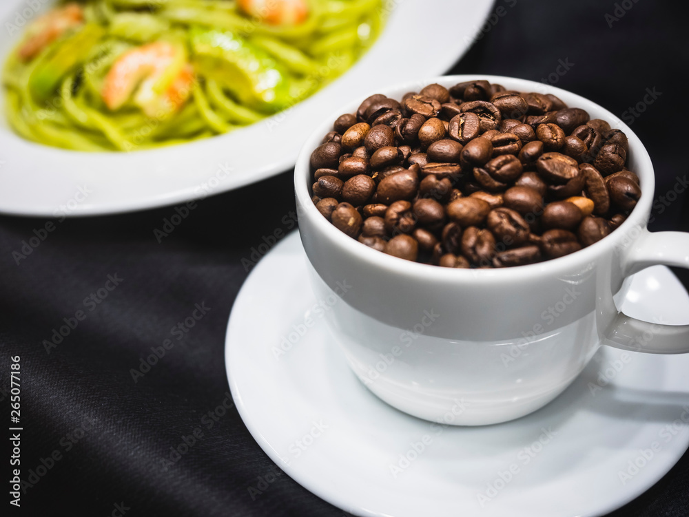 Coffee cup with coffee beans Cafe menu with spaghetti plate food and drink