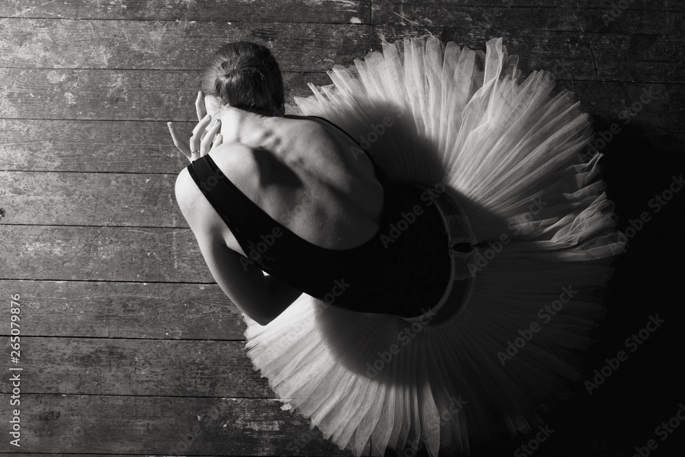 Ballerina in ballroom. Ballet dancer in studio. Black and white monochrome. Art of ballet.