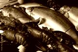various raw seafood including lobster, salmon fish and squid