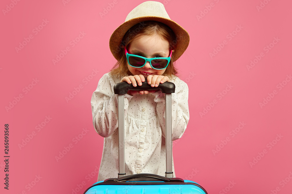 Smiling little girl in sunglasses and straw hat, holding suitcase on isolated pink, sincerely expresses joy and anticipation.