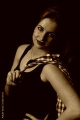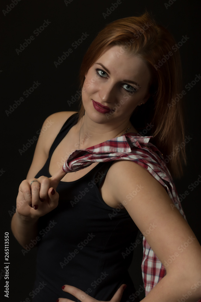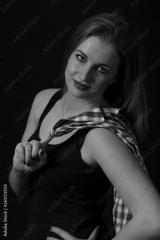 Low key portrait of posing beautiful young woman looking at the camera dressed in a black tank top and plaid shirt draped over her shoulder.