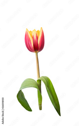 A single red and yellow tulip flower isolated on a white background