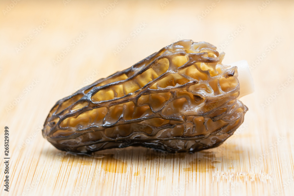 Fresh kitchen-ready Morchella esculenta on cutting board.