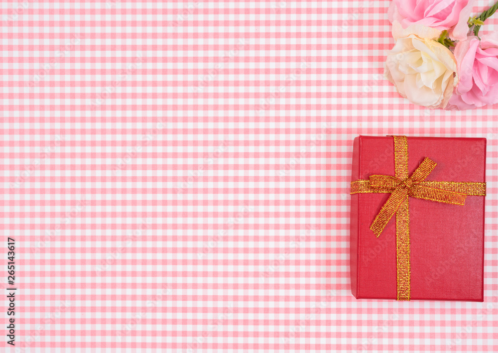 gift box with red isolated on Plaid background. Holiday decoration for Mother's Day or Women's Day.