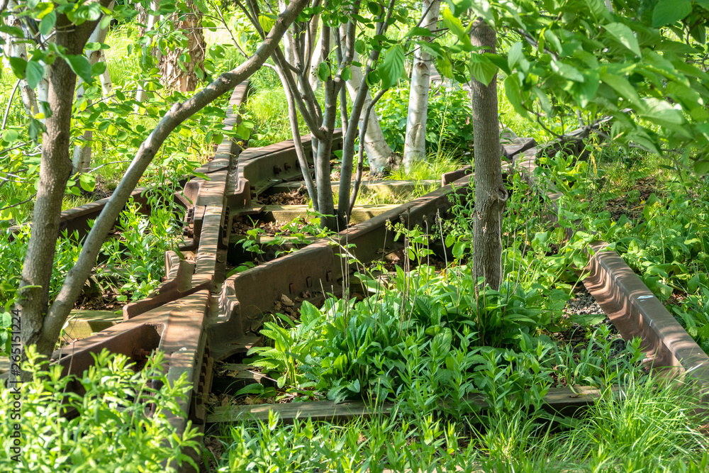 overgrown tracks with bushes and trees